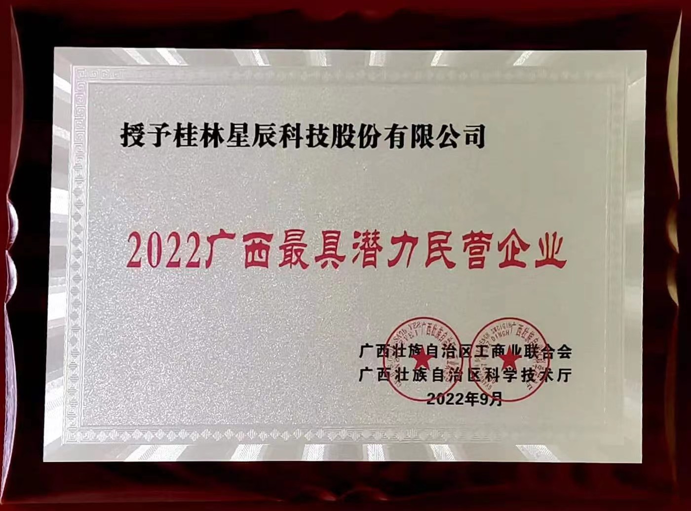 2022年9月6日,“2022廣西民營(yíng)企業(yè)100強(qiáng)”發(fā)布會(huì)在柳州召開(kāi)。廣西工商聯(lián)根據(jù)企業(yè)在國(guó)內(nèi)市場(chǎng)占有率、行業(yè)排名和擁有核心技術(shù)等領(lǐng)域上的潛在實(shí)力,評(píng)選出了“2022廣西最具潛力民營(yíng)企業(yè)”“2022廣西最具競(jìng)爭(zhēng)力民營(yíng)企業(yè)”等榜單。星辰科技在眾多企業(yè)中脫穎而出,成功評(píng)選為“2022年廣西最具潛力民營(yíng)企業(yè)”。