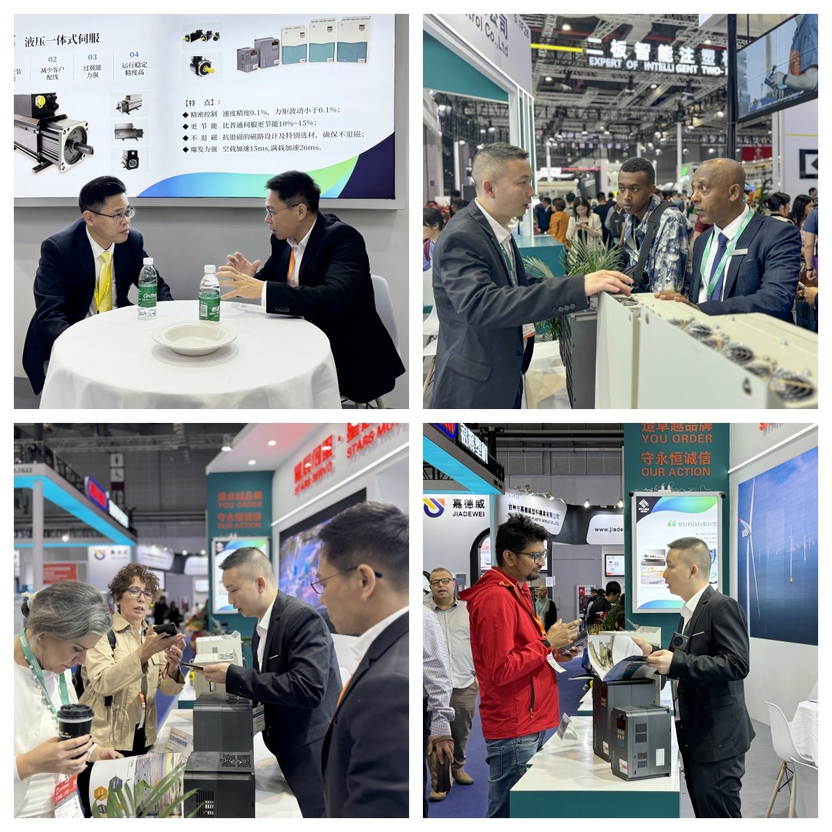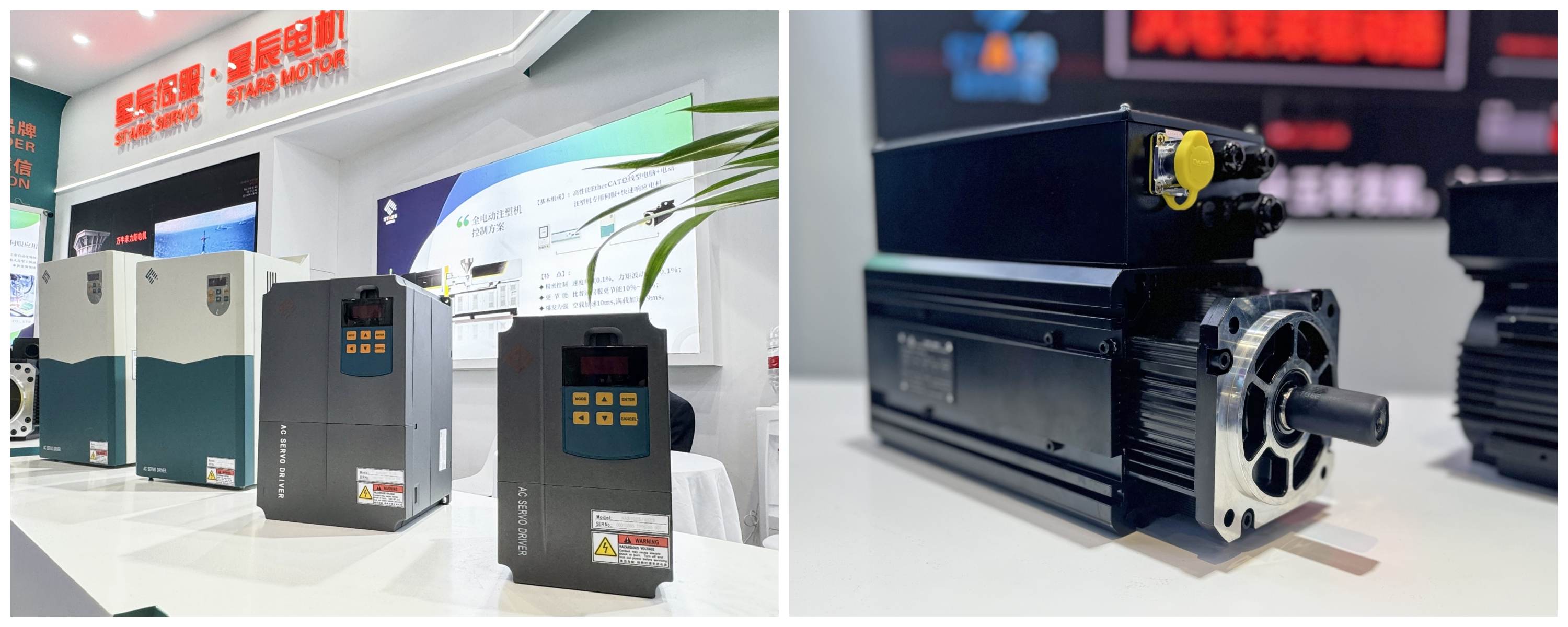 展會上,星辰科技展示了多款液壓一體式伺服、5.5kW-110kW交流伺服驅動器及5kW-110kW交流永磁同步電機??蓱糜谧⑺軝C、彈簧機、激光切割機、機器人等先進制造領域。